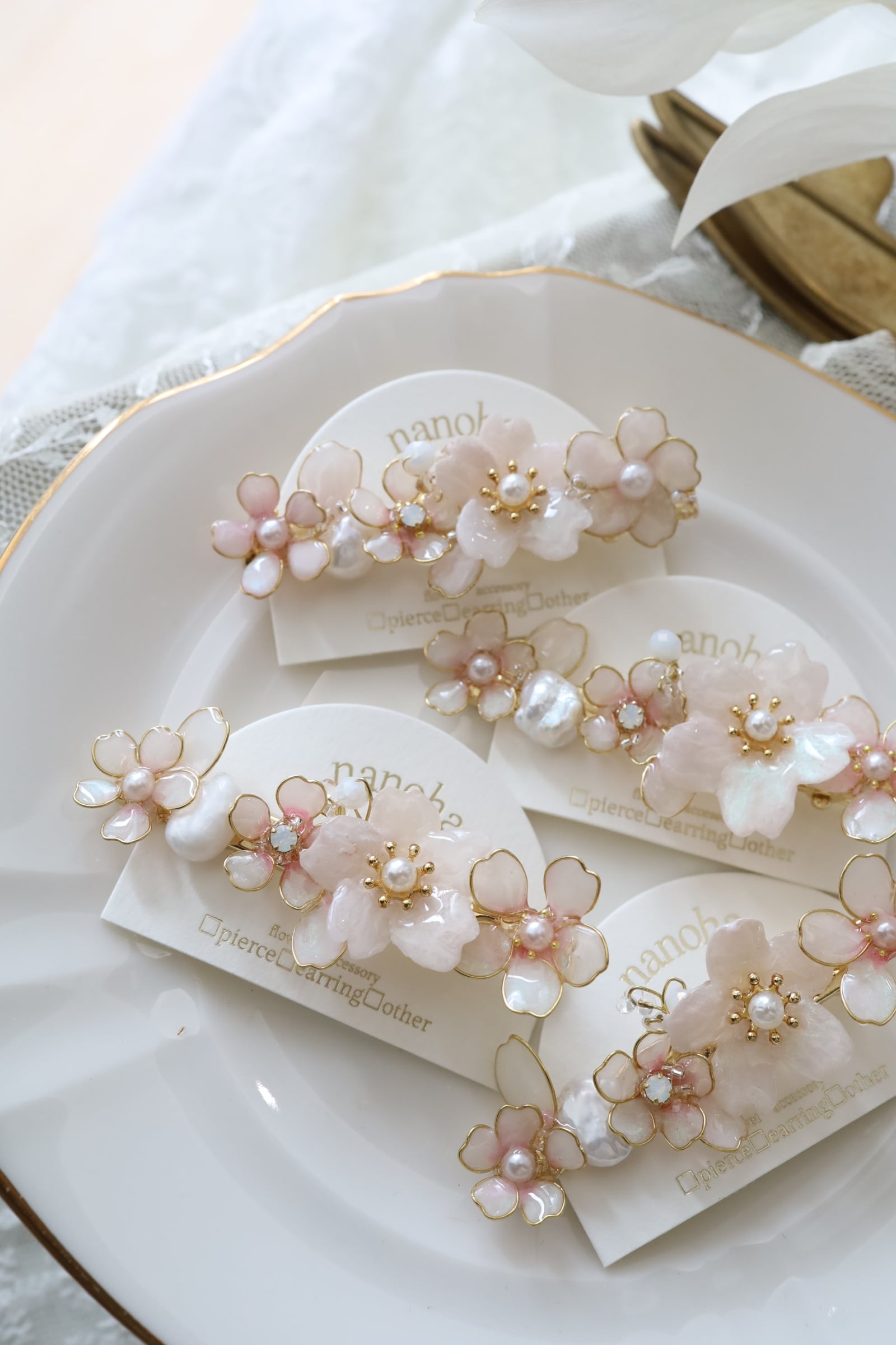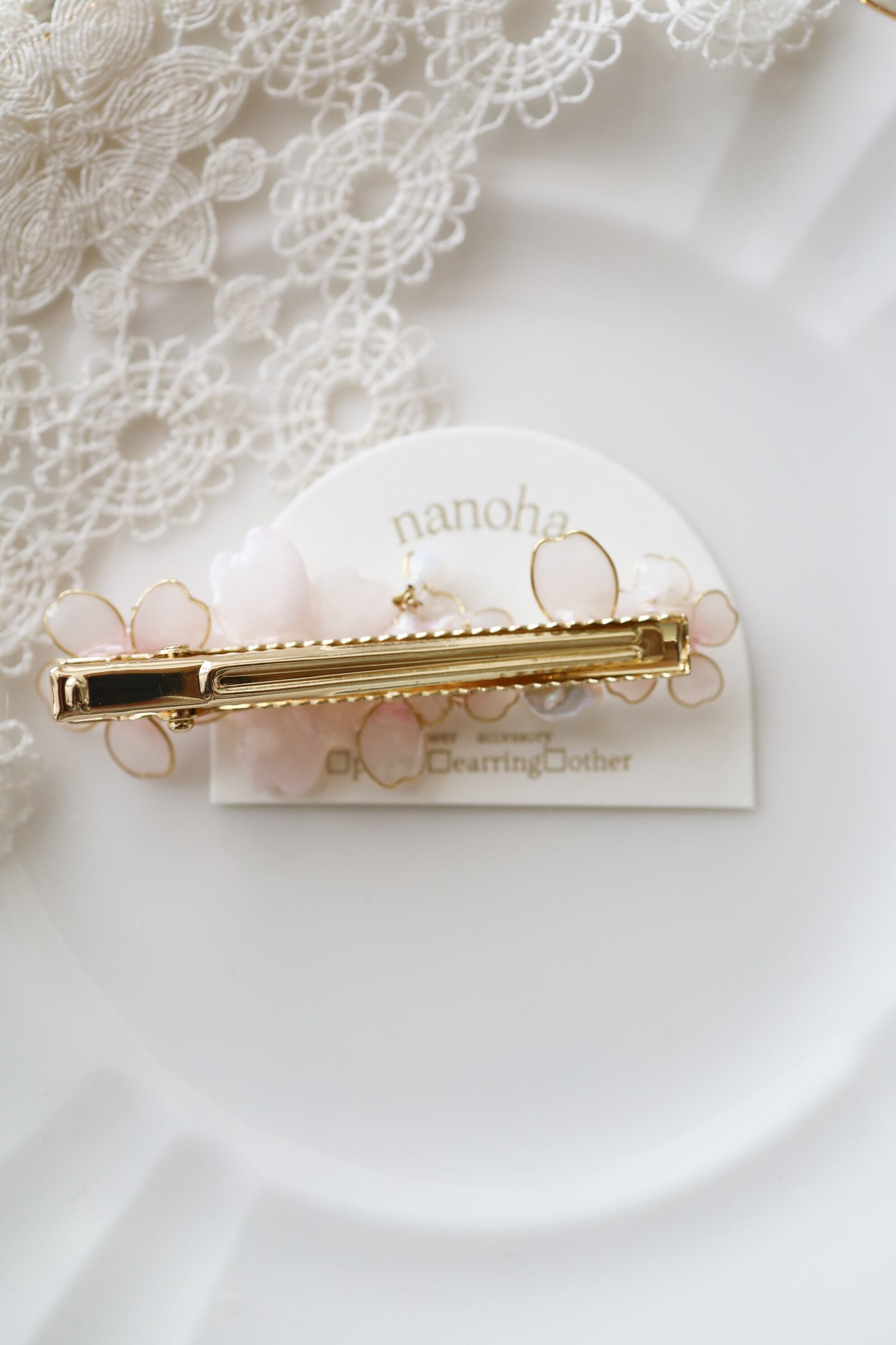 プリザーブドフラワーをレジン液で加工した後、独自の配合で作ったパールのようなラメ感のあるカラーを全体に塗布しているので、桜がより美しく見えます。